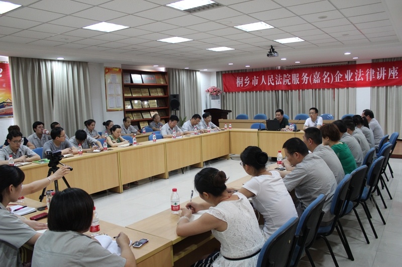 7月27日(周六)下昼,,,,应公司约请,,,,桐乡市人民法院走进尊龙凯时公司为企业提供执法效劳,,,,在公司行政楼三楼多功效厅,,,,举行了一次执法专题讲座。。。。公司向导、营销中心各部分全体职员,,,,财务治理部、信用治理部、票鹄胛理部、采购物控部、经编事业部的营销、生产、财务认真人等30余人加入了聚会。。。。